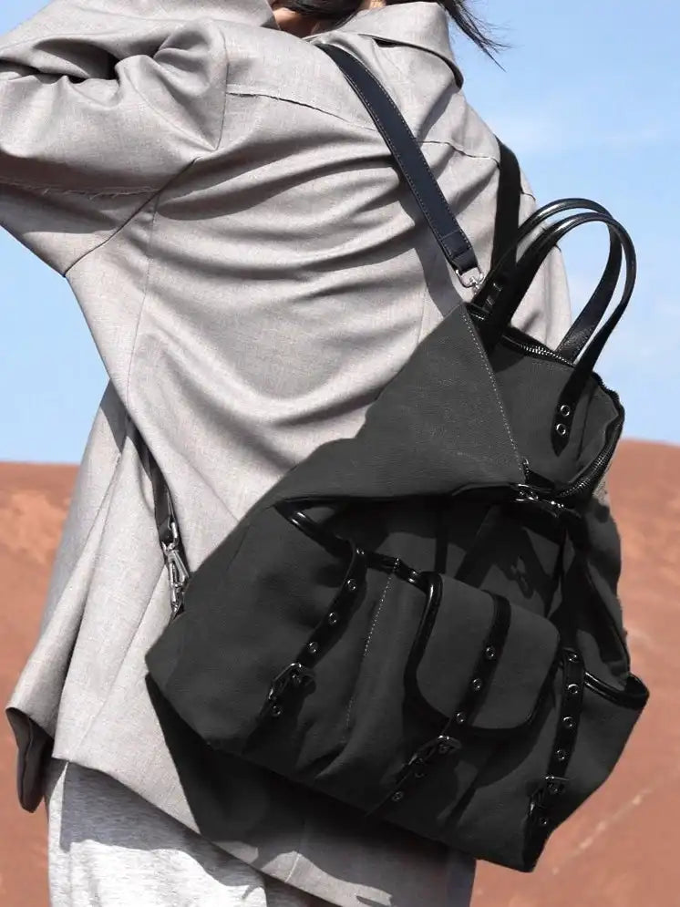 Adapt to every journey in absolute darkness. The Nomad-Utility in Black is a shape-shifting masterpiece designed for the modern explorer who refuses to be defined. It transforms from a sleek, authoritative tote into an aggressive, dark-wear backpack in seconds. It swallows laptops, gym gear, and travel essentials with ease, all while maintaining a fiercely minimalist profile.