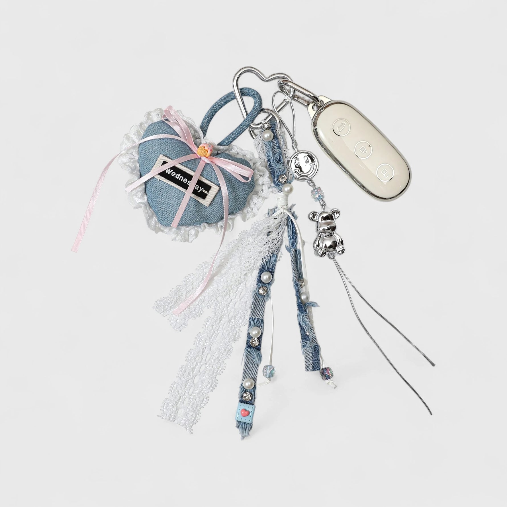 A little romance for your everyday bag. This Lace-Denim Heart layers soft washed denim with ruffled lace, a satin bow, faux-pearl trims and a tiny silver bear charm—sweet, feminine, and surprisingly chic. Clip it on in one second to give your tote or crossbody that “effortlessly put-together” look. It swings lightly as you walk and catches the light just enough to be noticed.