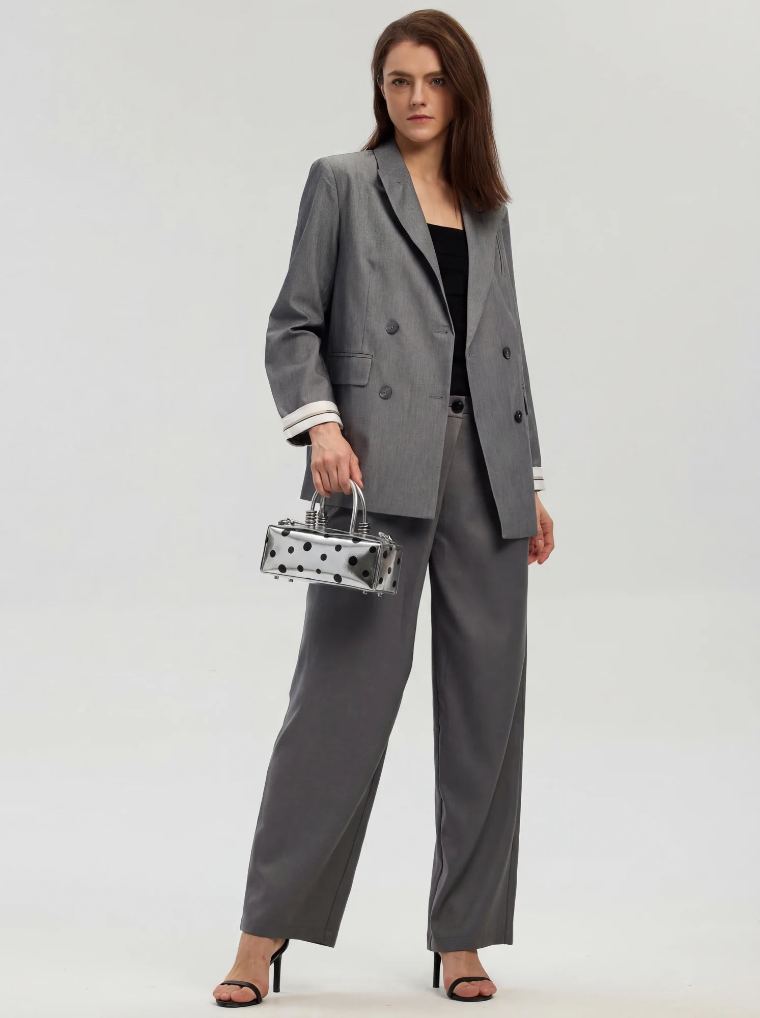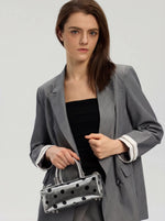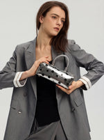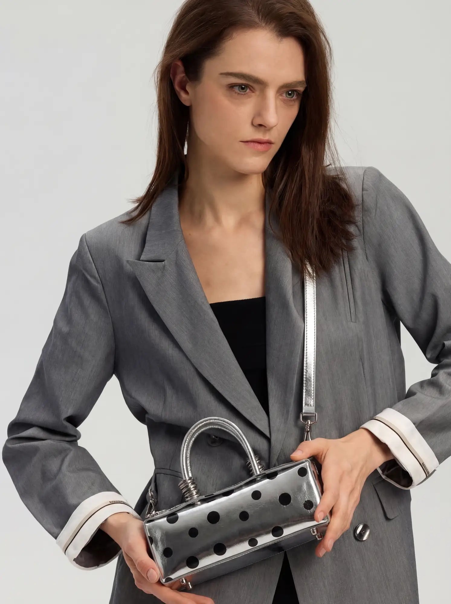 Forget everything you know about polka dots. The Bar in metallic silver is a high-shine disruptor. Featuring bold black dots on a reflective silver cowhide canvas, this elongated baguette bag bridges the gap between Studio 54 glamour and brutalist streetwear.