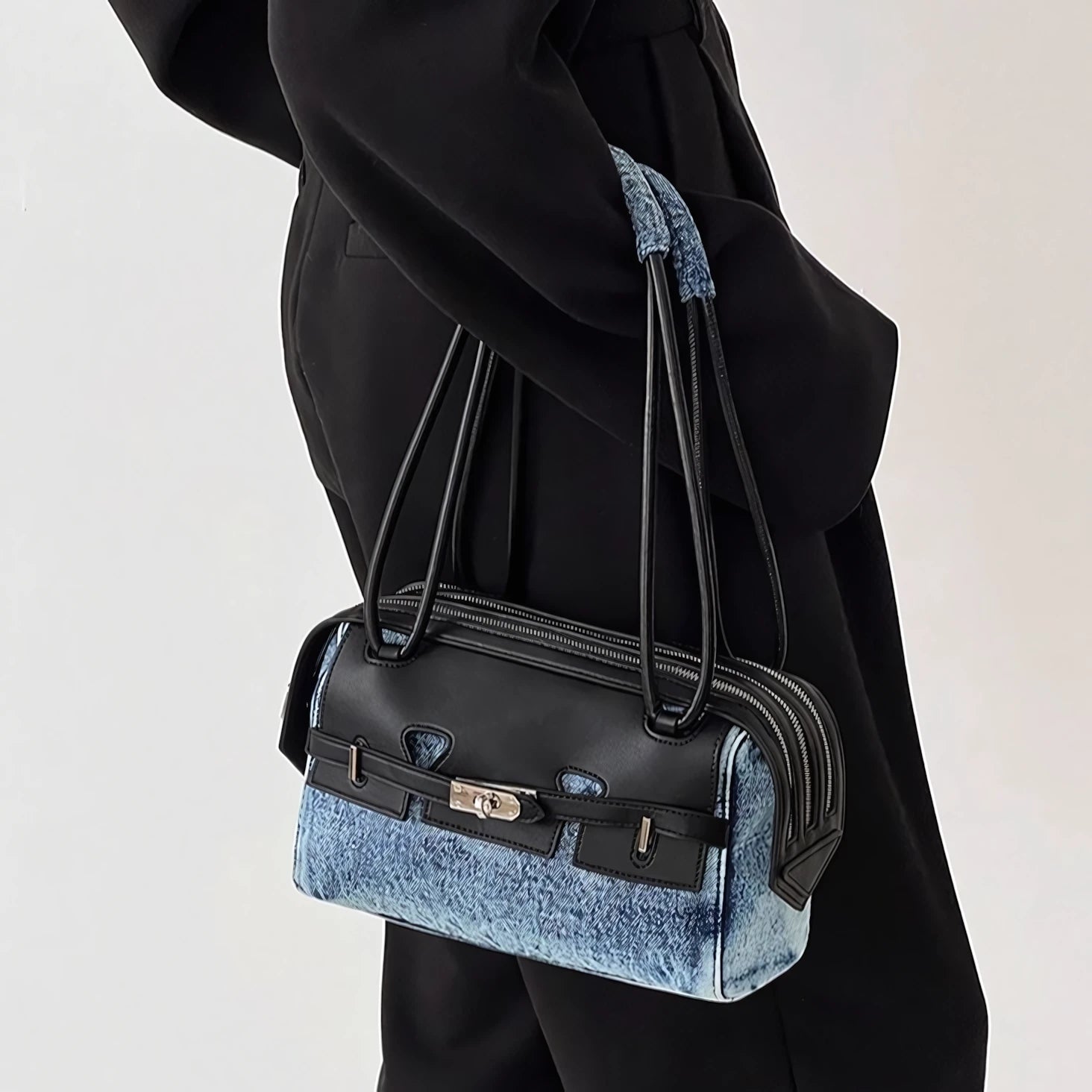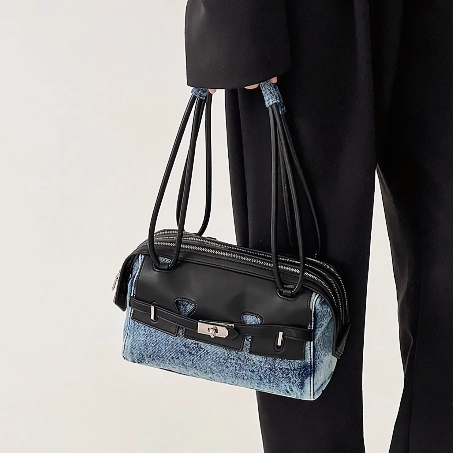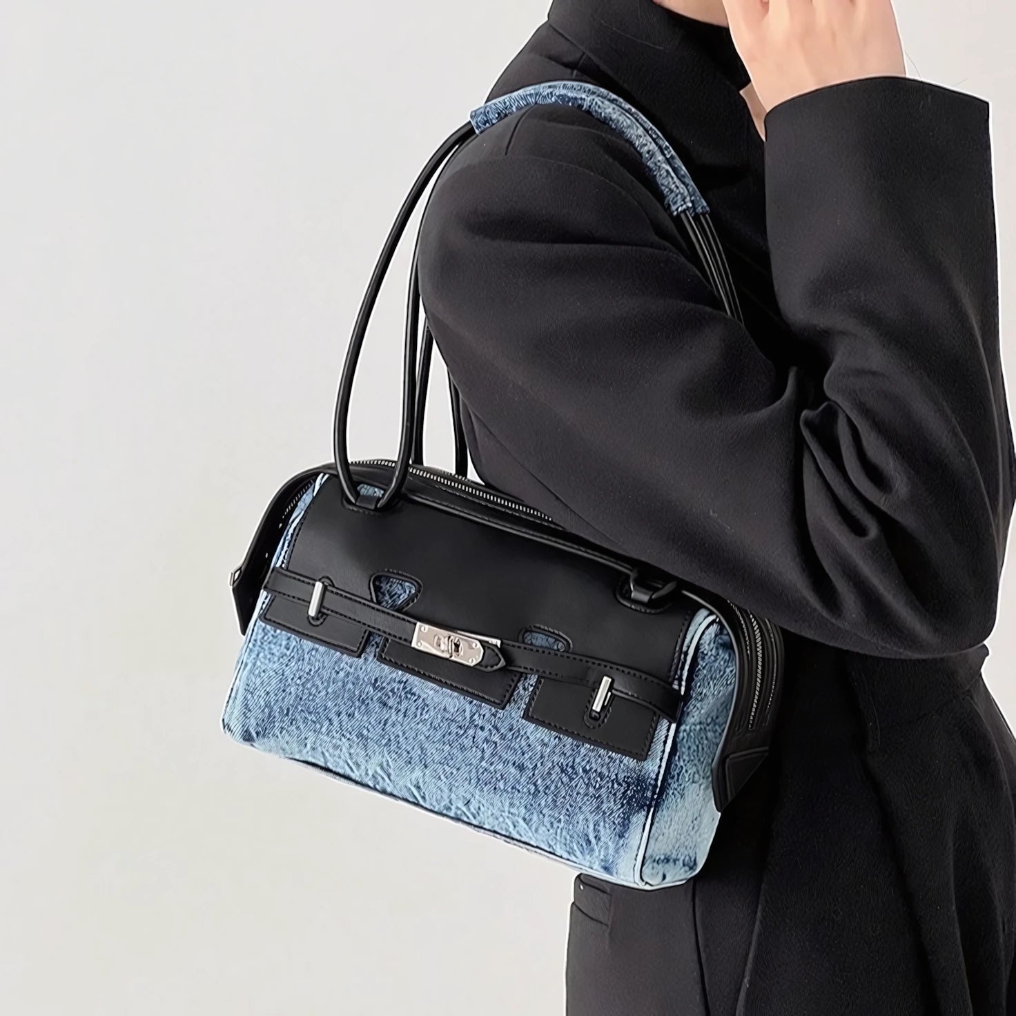 - Materials: Denim fabric with vegan-leather trim; silver-tone hardware; front turn-lock accent.