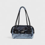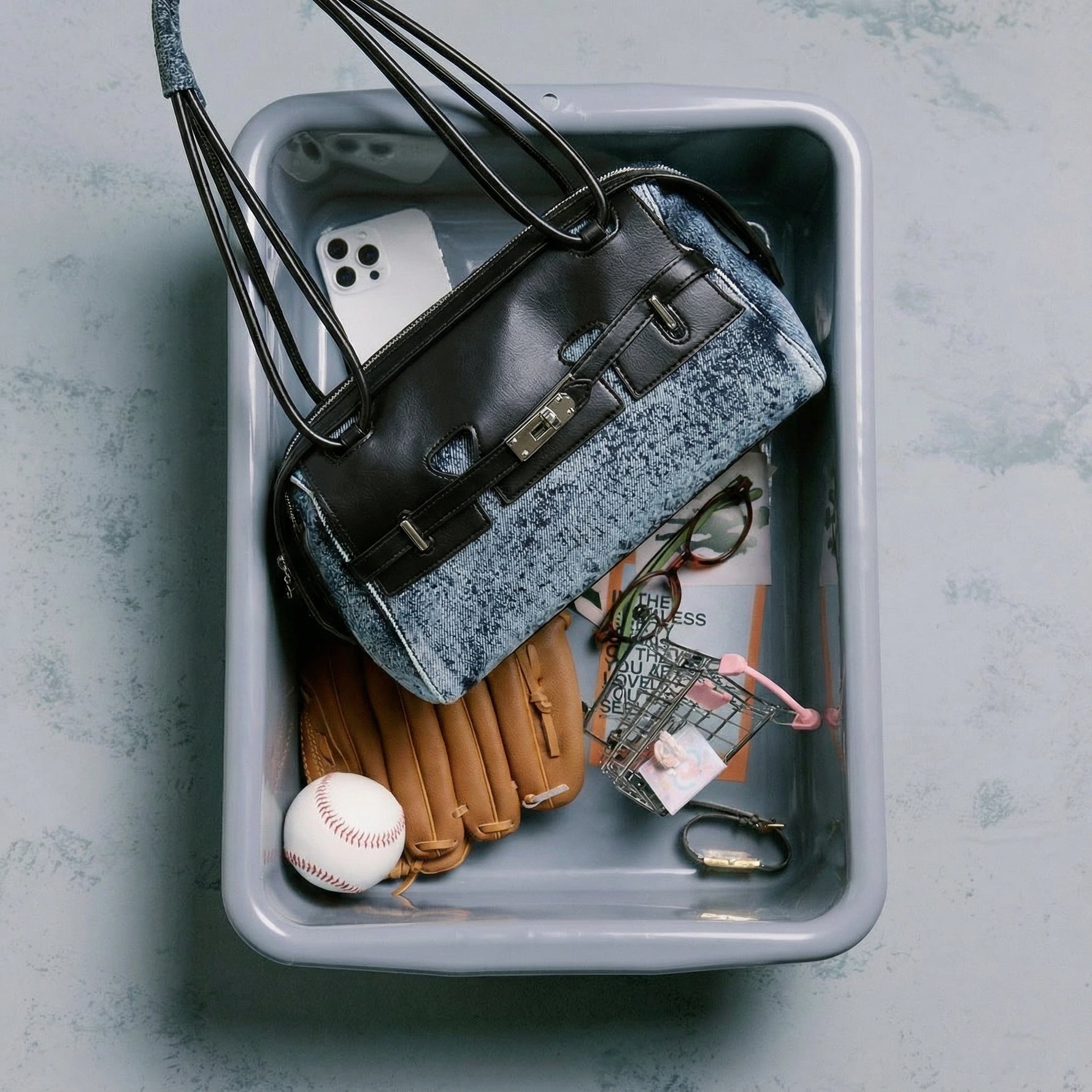 A love letter to Americana cool. Blue Highway pairs sun-faded denim with inky vegan leather so you can stride from coffee run to late-night gallery openings without skipping a beat. Three smooth top zips keep life sorted; extended handles slip comfortably under the arm, and the optional crossbody frees your hands when the city speeds up. Structured, confident, and just different enough to get noticed—because you are, too.